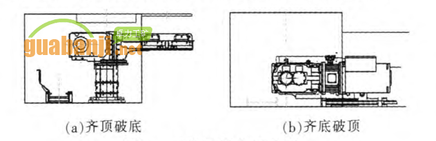 薄煤層工作面一般分為:“齊底破頂”和“齊頂破底”兩種布置方式(見(jiàn)圖1)。在實(shí)際工作中,為了保證刮板輸送機(jī)在采高較低的情況下具有足夠的卸載高度,盡可能減少“回煤?隋況的出現(xiàn)。一般都選用“齊頂破底”的方式,即順槽頂板與工作面頂板平齊,但順槽底板要低于工作面底板,使刮板輸送機(jī)機(jī)頭與順槽中轉(zhuǎn)載機(jī)卸料段之間留有足夠的高度差。