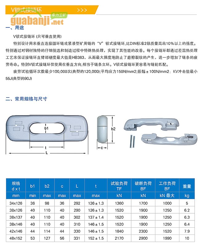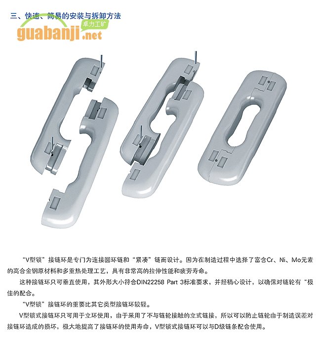 特別設(shè)計(jì)用來垂直鏈接圓環(huán)鏈或緊湊型礦用鏈的v鎖式接鏈環(huán),比DIN標(biāo)準(zhǔn)2級(jí)質(zhì)量高出10%以上的強(qiáng)度。